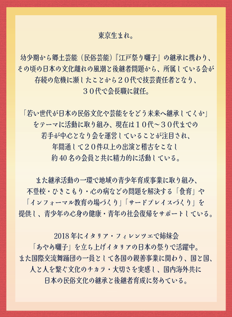 現在代表を務める郷土芸能の会は年間通しての稽古と年間行事への出演、技芸継承、青少年育成活度を行っており、過去に「東京都青少年育成協力者感謝状」を授与される。
